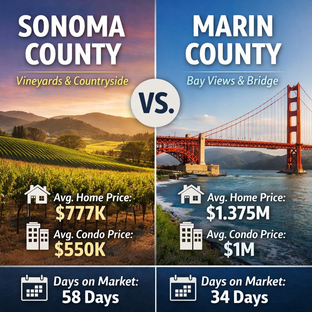 In this blog, we will examine the characteristics that make Sonoma and Marin unique, highlight current average prices for condos and single‑family homes, break down the average days on market, outline the towns within each county, and discuss the pros and cons of living in these counties. If you’re considering buying or selling in the North Bay, or if you’re simply curious about how the markets stack up, read on for a detailed comparison.